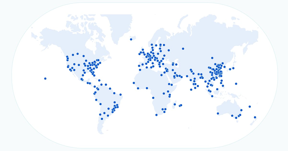 Cloudflareのネットワークは300都市、100か国以上(中国本土を含む)に展開しています。結果、Cloudflareが提供する世界最速クラスの広範なグローバルネットワークは、何百万ものWebプロパティで信頼を得ています。 ほぼすべてのサービスプロバイダーとクラウドプロバイダーが直接接続するCloudflareネットワークにおいては、世界のインターネット人口のおよそ95%のユーザーは、約0.05秒圏内にあります。