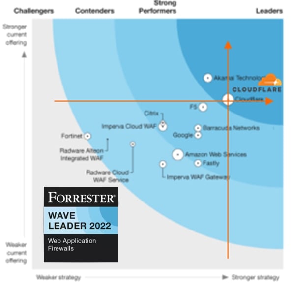 Cloudflare(クラウドフレア)は、Forrester Research, Inc.による「The Forrester Wave™: Web Application Firewalls, Q3 2022」レポートで「リーダー」に選出されたことを発表しました。CloudflareのWebアプリケーションファイアウォール(WAF)ソリューションは、イノベーション、パートナーエコシステム、コミュニティなど、10個の基準で最高スコアを獲得しました。また、「CloudflareのWebアプリケーションファイアウォールは、設定とルールの作成で特に優れる」また、「Cloudflareは活発なオンラインユーザーコミュニティとそこでの応答時間の基準で群を抜く」と評価しています。