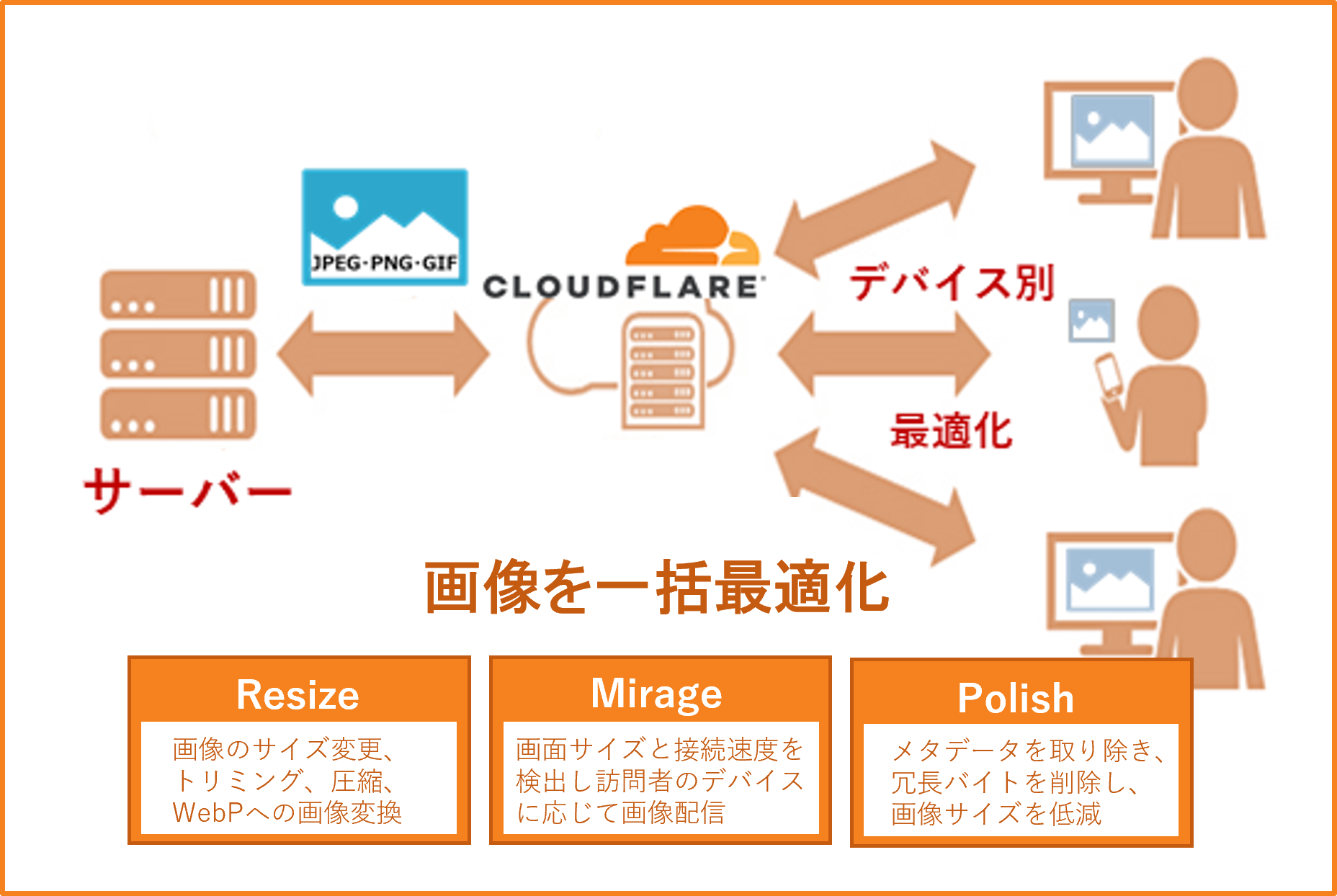 サイト遅延の一番の問題点は、間違いなく重い画像にあります。手を付けやすいようで、サイト上には、多くの画像がさまざまな形式で使われており、一つひとつ最適化するのは、あまりにも手間のかかる作業です。Cloudflareを導入すると、ドメイン内の全ページの画像が一括で最適されます。