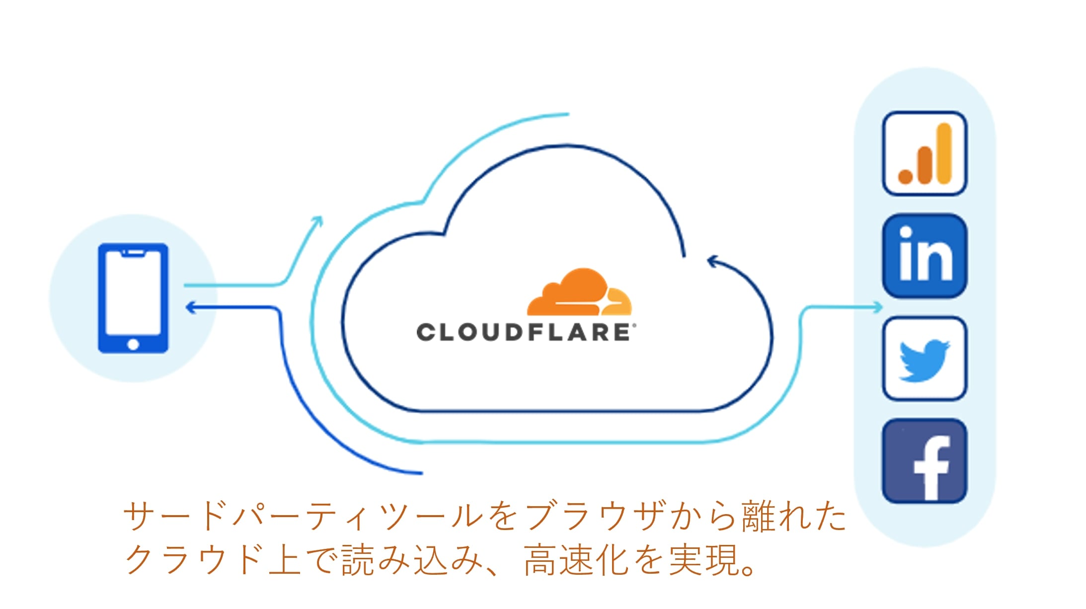 Cloudflareは、サードパーティツールをブラウザから離れたクラウド上で読み込み、高速化とセキュリティおよびプライバシー保護の強化を実現します。分析ツール、広告ピクセル、ウィジェット、その他のサードパーティツールを、コードを変更することなく簡単に読み込めます。