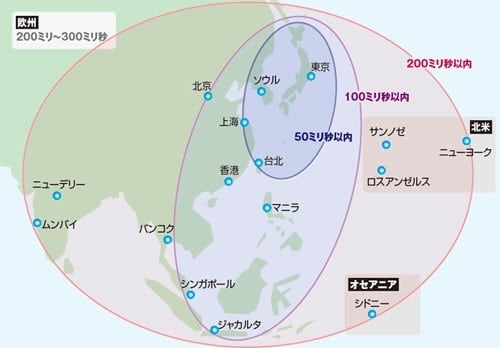 海外の拠点から東京のデータセンターにアクセスする場合の伝送遅延を表した下の図をご覧ください。