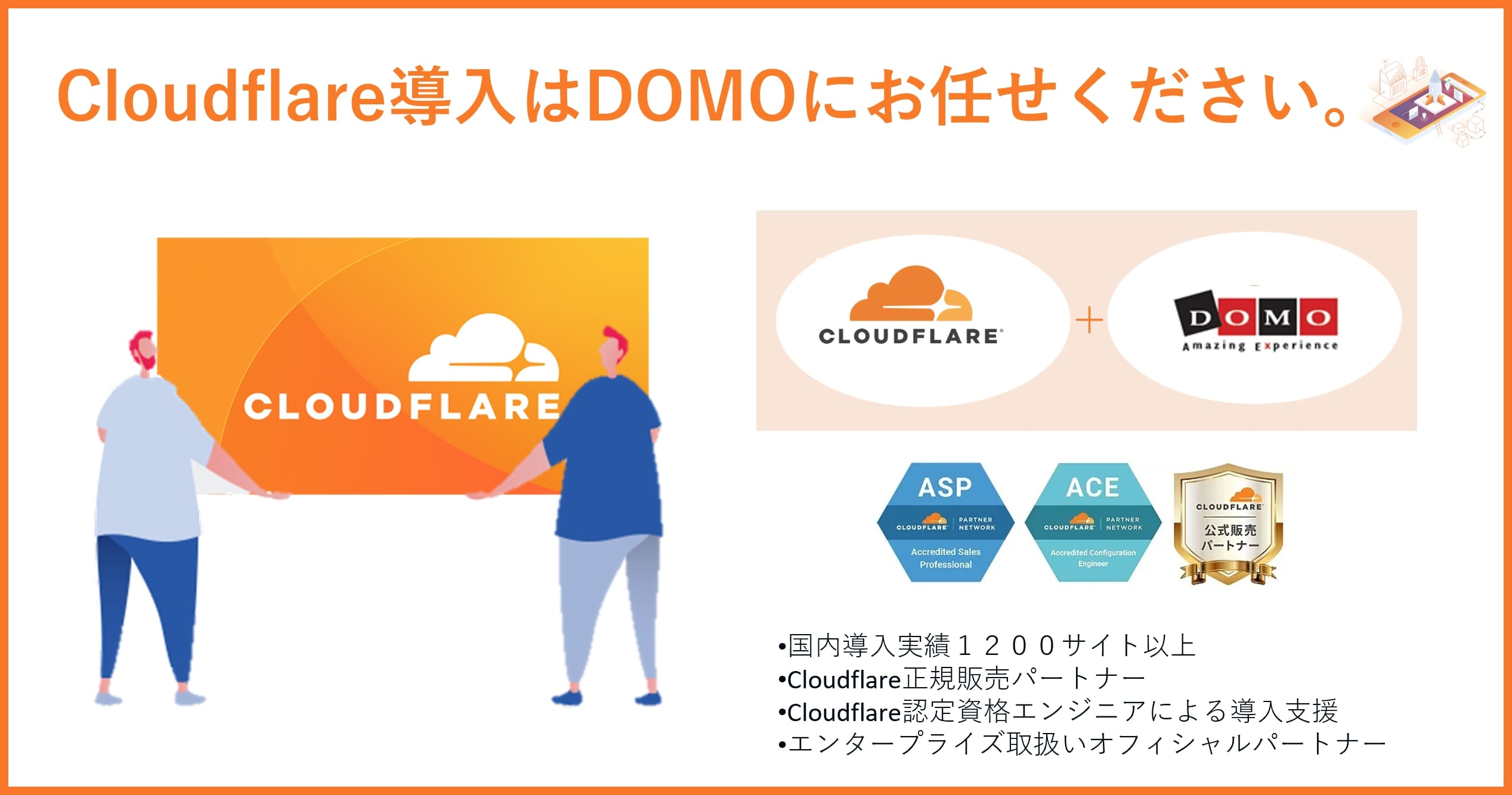 DOMOはCloudflareエンタープライズ(最高位プラン)の公式パートナーでありながら、プロ、ビジネスプランなどのミディアムクラスの導入支援をメインに行っている国内では数少ないパートナーです。Cloudflare社認定資格ACE取得エンジニア/ASP取得営業が責任をもって、導入から運用までサポートいたします。